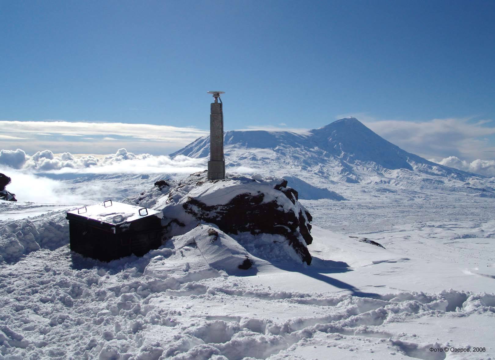 Fall 2006: The 2006 participants of the PIRE project met at the AGU conference in December to present results and discuss the future of projects. In September of 2006, Vilory Bahktiarov and a group of workers from the Institute of Volcanology and Seismology in Kamchatka successfully installed 7 continuous GPS stations around Bezymianny. These stations will collect ground deformation data year-round, allowing researchers to model how magma moves within the crust beneath Bezymianny. Photo of site by A. Ozerov
