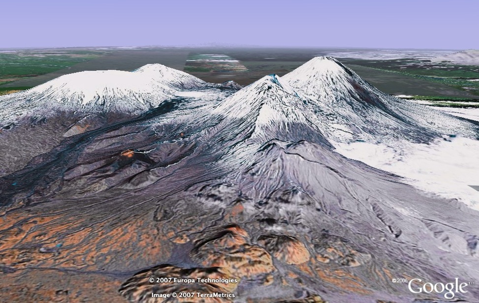 Geological SettingBezymianny is part of the Klyuchevskoy Group in the Central Kamchatkan Depression and is dwarfed by its much larger neighbors, Kamen and Klyuchevskoy. This volcanic region is located near the intersection of the nearly perpendicular intersection of the Aleutian arc with Kamchatka's Eastern Volcanic Front. The complex tectonics of this location have resulted in several theories for local magma generation. Image from Google Earth |