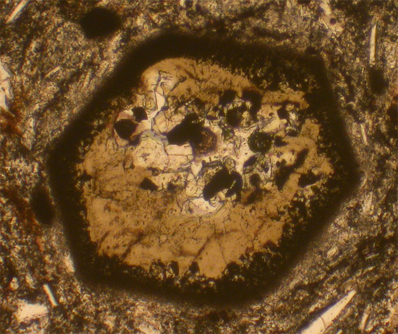 Vasily Scherbakov and Sasha Tsay (Moscow State University) are investigating the hornblende reaction rims (see left) of the 1956 andesitic pyroclastic deposits. Based on detailed study, they have measured the temperature, pressure and time parameters associated with rim formation. By examining samples collected during this past summer, Vasily and Sasha will estimate the T-P dynamics of Bezymianny's magma chamber during the last 50 years.