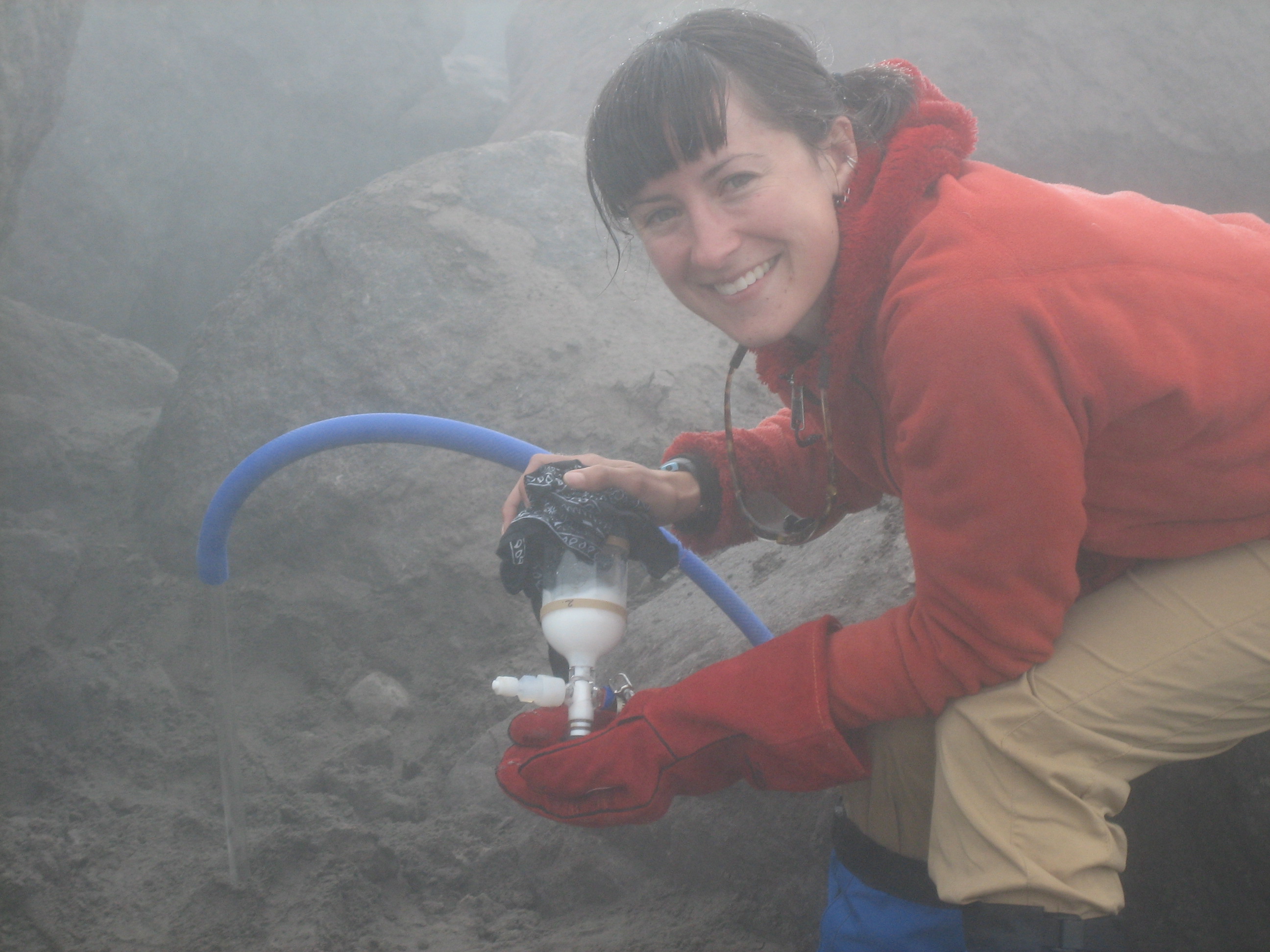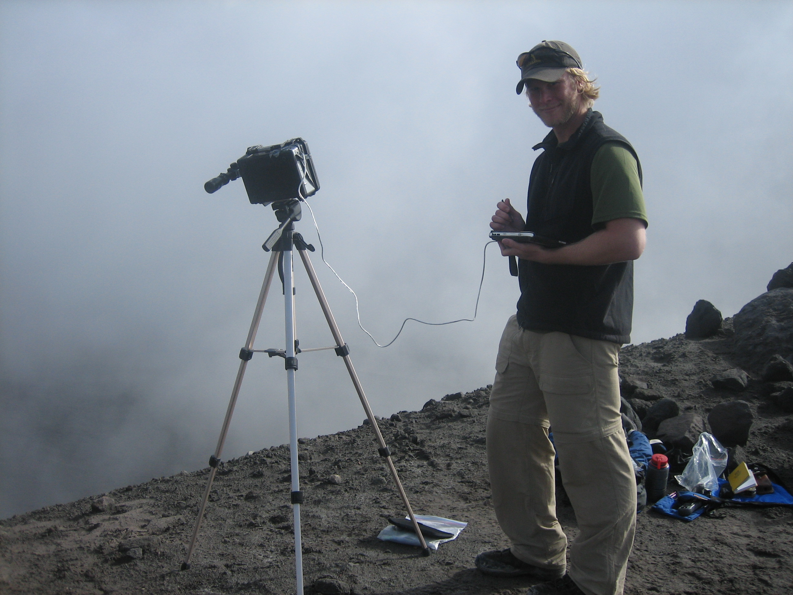 Volcanic GasesTaryn Lopez (Univ. of Alaska, Fairbanks) and Tim Clark (Univ. of Maryland) measured volcanic sulfur dioxide emissions from Bezymianny using a FLYSPEC (UV spectrometer system). Measurements were collected on eleven days from stationary points (scanning the plume) and by helicopter (flying under the plume). Fumarolic gas samples were also collected from the dome and the 2006 pyroclastic flow. There are two main objectives: (1) Generate a baseline dataset of Bezymianny's volcanic emissions in order to detect changes in gas chemistry and elucidate subsurface volcanic processes; (2) Validate satellite SO2 measurements, specifically for ASTER, MODIS, and OMI sensors. Future plans include continued collection of emissions data (FLYSPEC and direct gas samples in future field campaigns) and further validation the satellite sensors. For more information see Clark and Lopez's AGU abstract. |