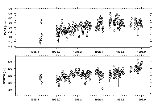 Figure: Horizontal motion of Lhasa relative to Kitab (Uzbekistan, on the Eurasian plate) based on daily solutions for the first nine months of 1996 plus six solutions from November 1995. The rms scatter of the daily estimates about the best-fit line is 8 mm in the east component and 4 mm in the north component of this 2438 km long baseline, giving velocity uncertainties of 3 mm/yr. east and 1 mm/yr. North. The zero point on the vertical axes is arbitrary.