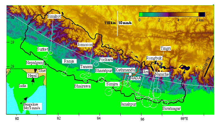 Figure: Velocities based on 1991-1995 Global Positioning System (GPS) measurements for 18 sites in Nepal and southern Tibet (Bilham et al., Nature in press). Velocities are shown relative to Bangalore (S. India). The white curved line indicates a smoothed small circle that approximates the Himalayan arc and follows a line of river incision and moderate earthquakes defined by Seeber and Gornitz (1983). The approximate location of the 1934 Bihar/Nepal earthquake is shown by a large ellipse in E. Nepal. Inset: ITRF92 Indian Plate vector and mean convergence direction between India and Tibet (Freymueller et al., 1996).