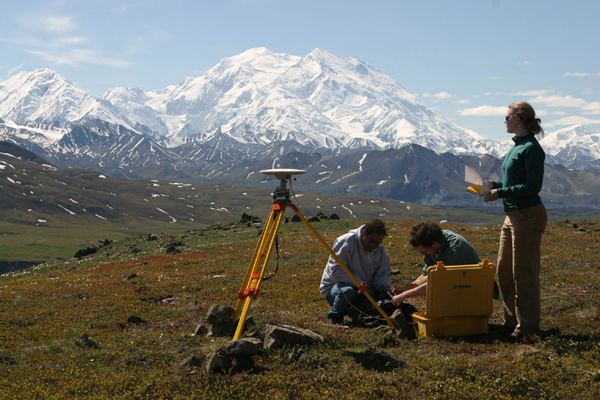 Former UAF graduate students Samik Sil, Tom Fournier and Kelly Kore set up a GPS site in