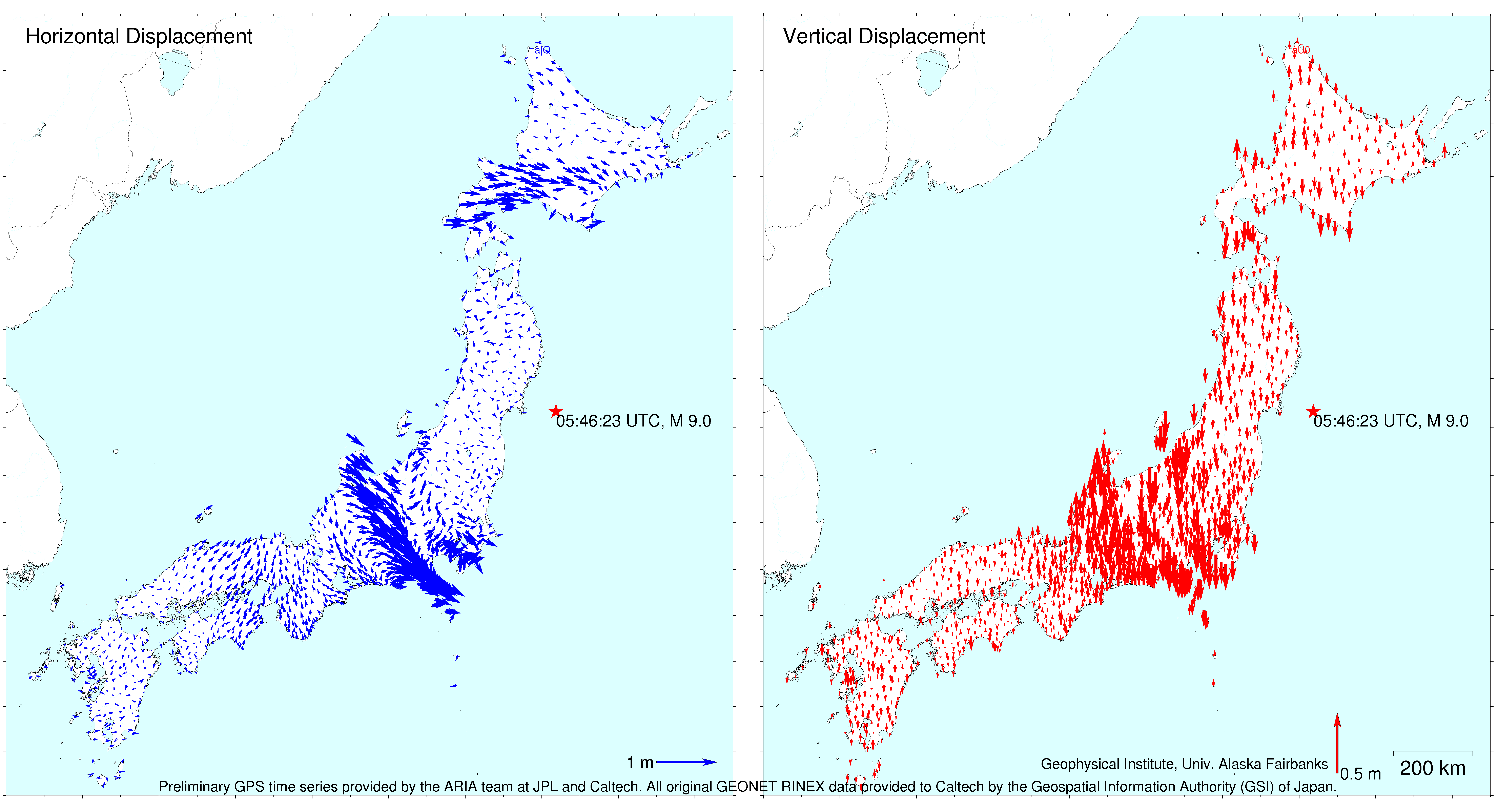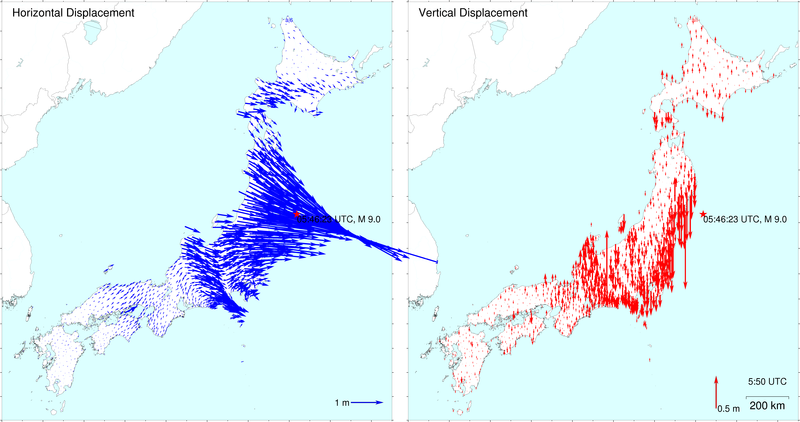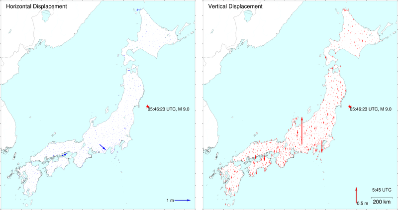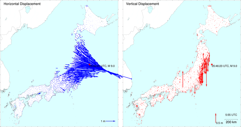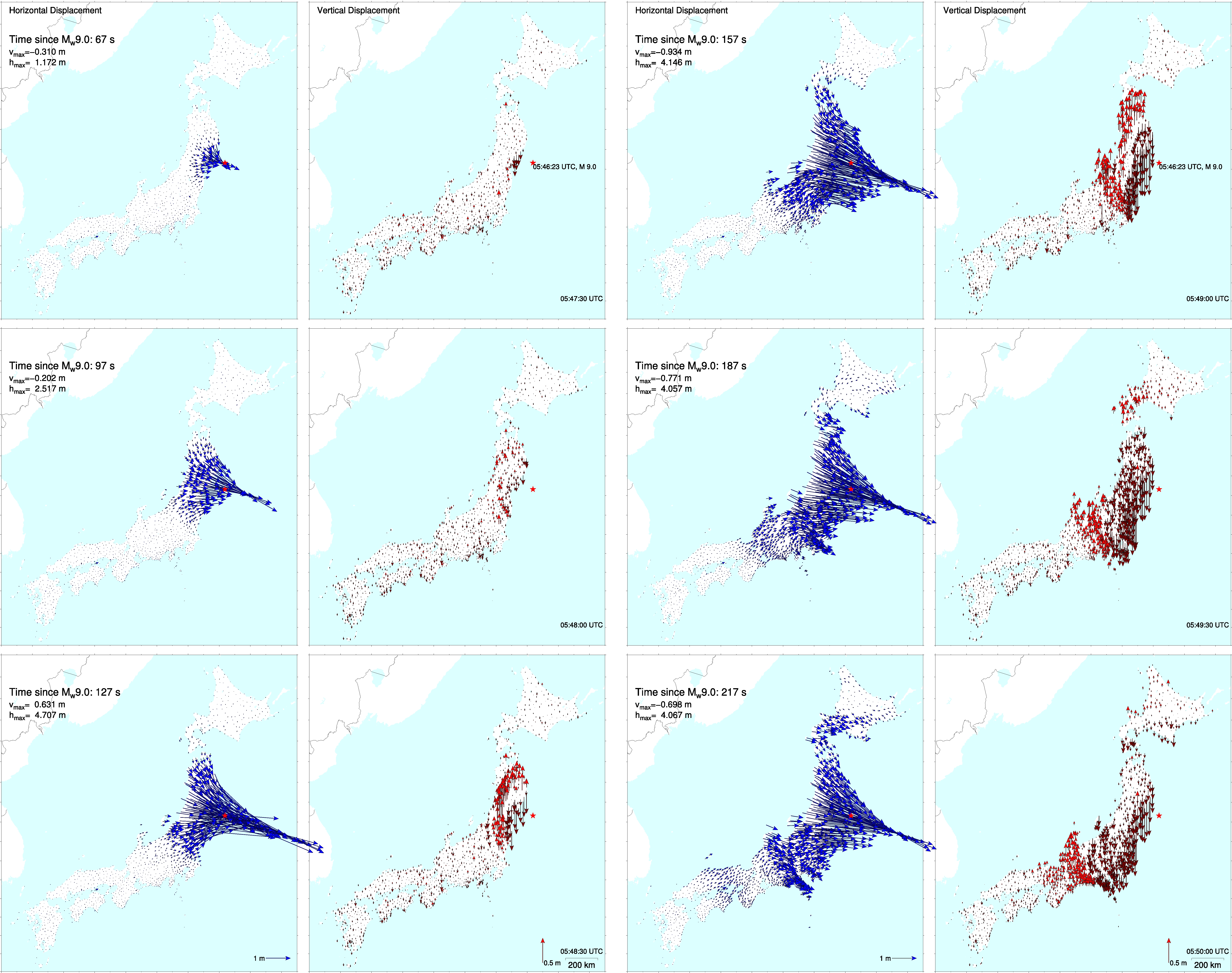 The data I used are the 5 minute solutions provided by ARIA/JPL/Caltech. I show displacements with respect to the first position calculated that day for each station. UTC time is given in the lower right corner. The center panel clearly captures the surface wave in the Tokio and southern Hokkaido region. It's going concentrically outwards from the main shock and visible in both the vertical and horizontal fields, though a little more obvious in the horizontal. The vertical clearly changes sign. The lower panel shows the permanent displacements after the main shock. Carl Tape alerted me to tickle out the dynamic feature so I subtracted panel 3 from panel 2 to get the lower panel. Thanks.
