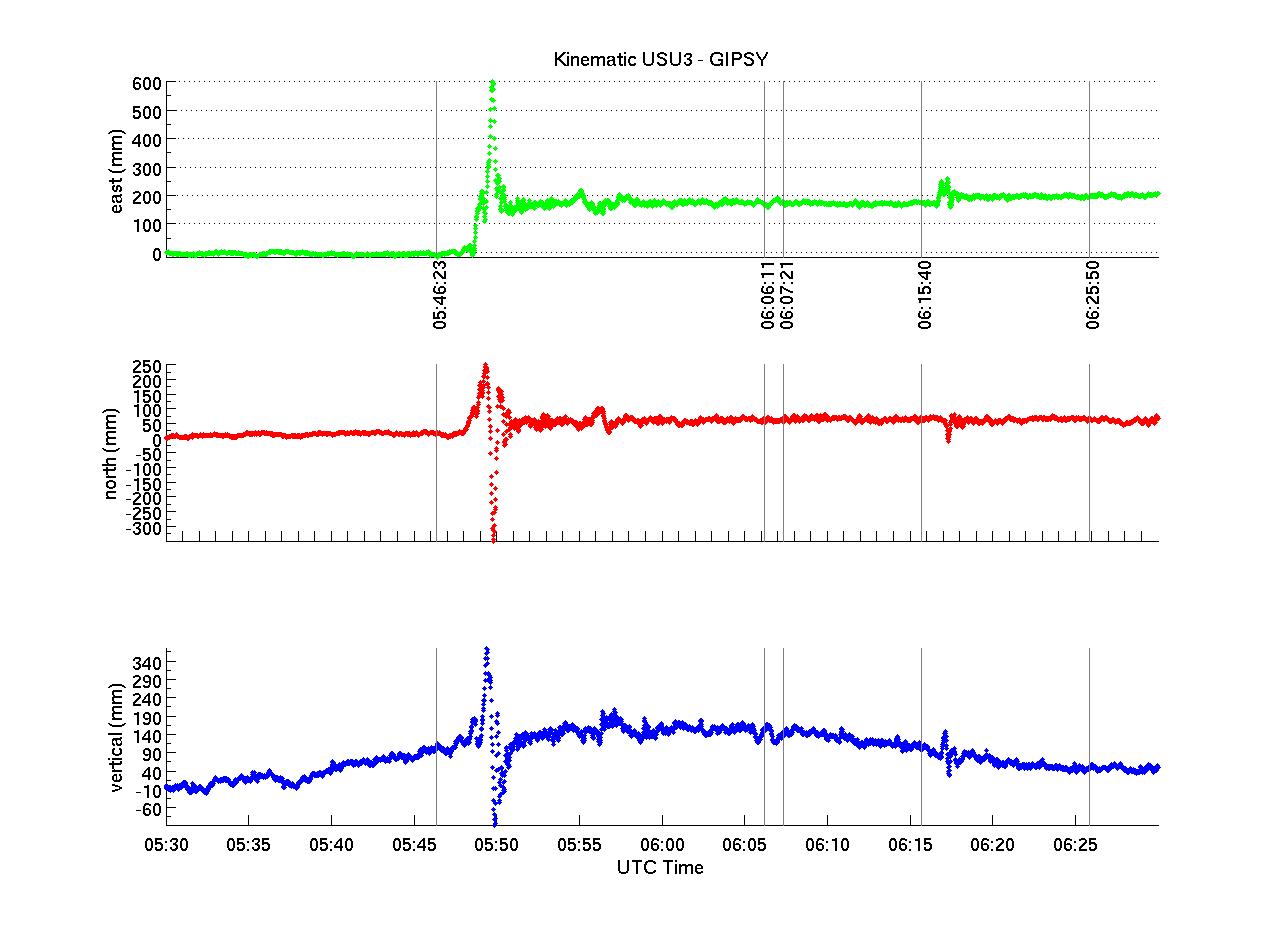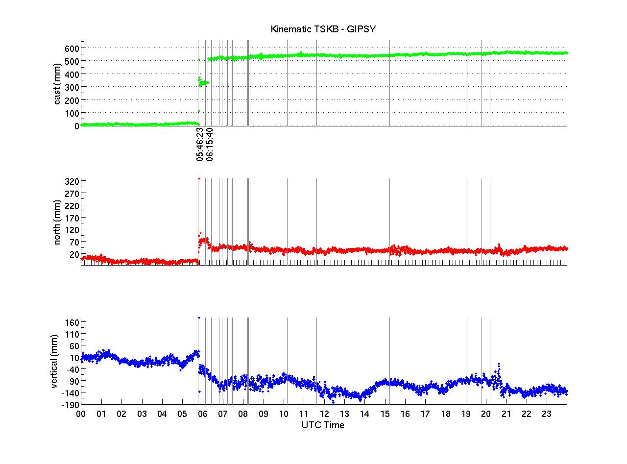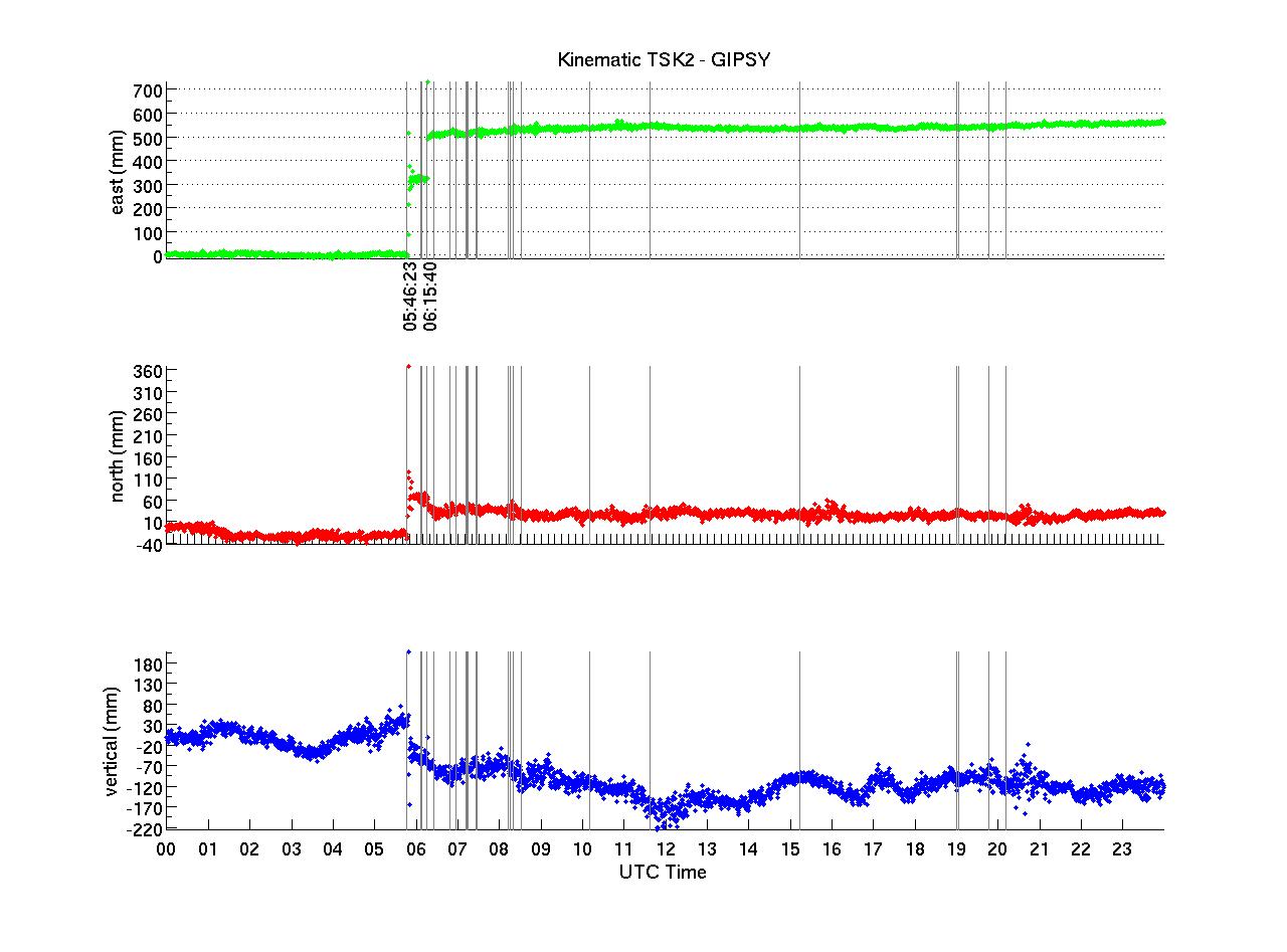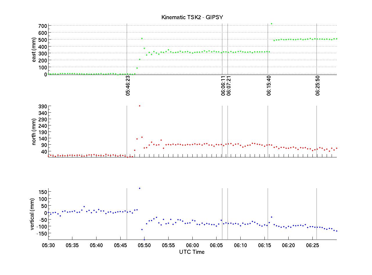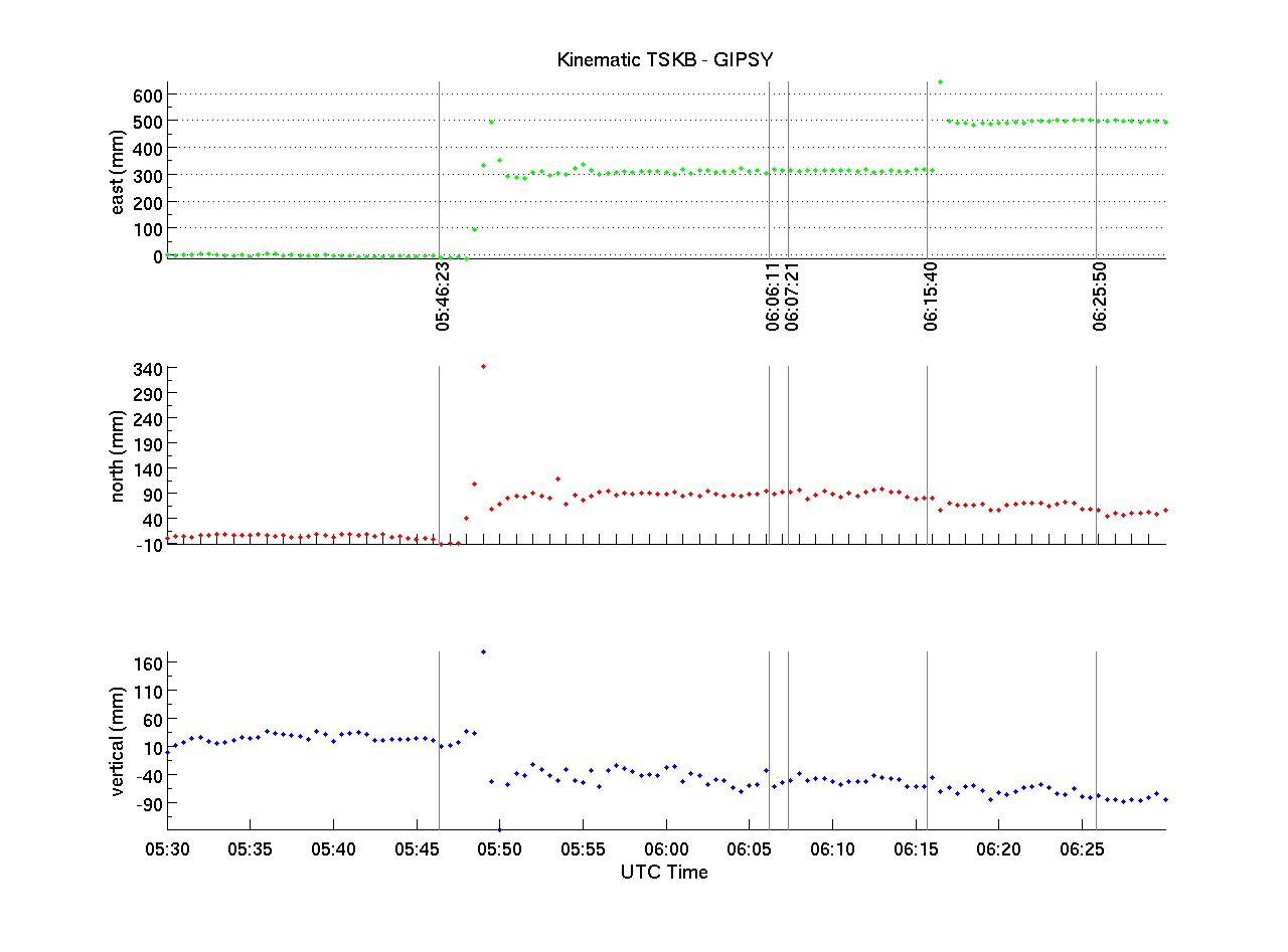 The long wavelength features in the vertical component of USU3 during the time of the earthquake does not seem to be related to the event since the full day solution shows multiple such excursions. Only processing of additional days will allow for an interpretation of this signal. However, I want to draw your attention to the vertical signal for stations TSKB/TSK2 which are nearly co-located (~40 m apart). The signals appear rather similar for these two sites mainly with a strong subsidence signal after the earthquake (about 18-20cm peak to peak). Due to the different geometry at these sites and the amplitude of the signal, this is unlikely to be a multi path effect and might be due to a long wavelength loading signal. Which due to the nature of load displacements is unlikely to be visible in the horizontal. We speculate this to be due to changes in ocean load (tsunami).