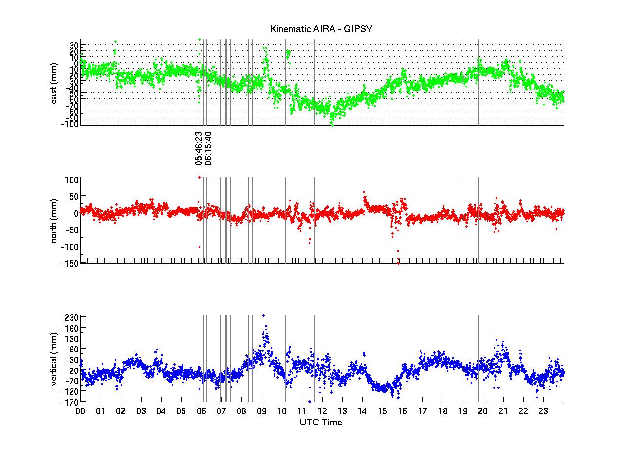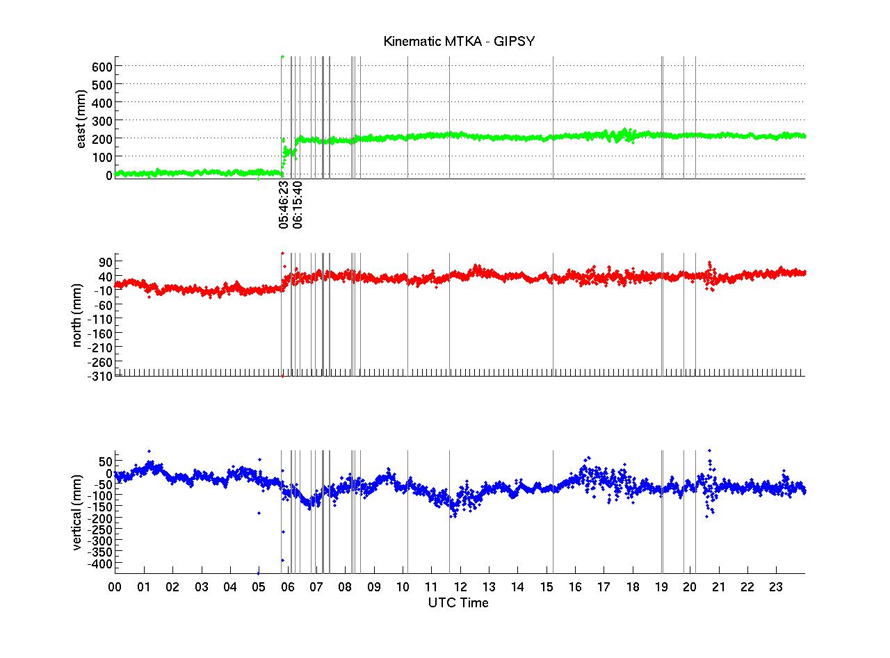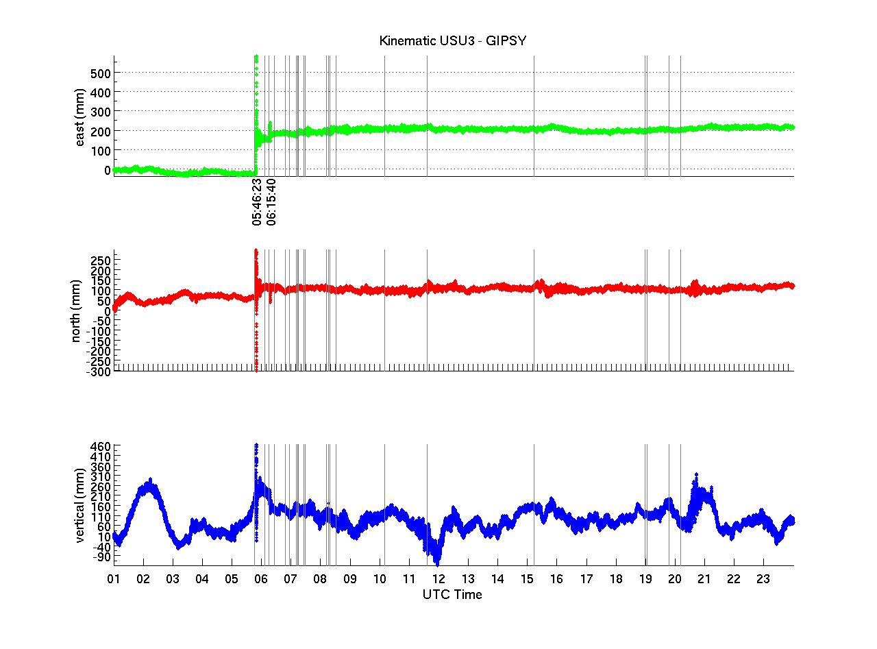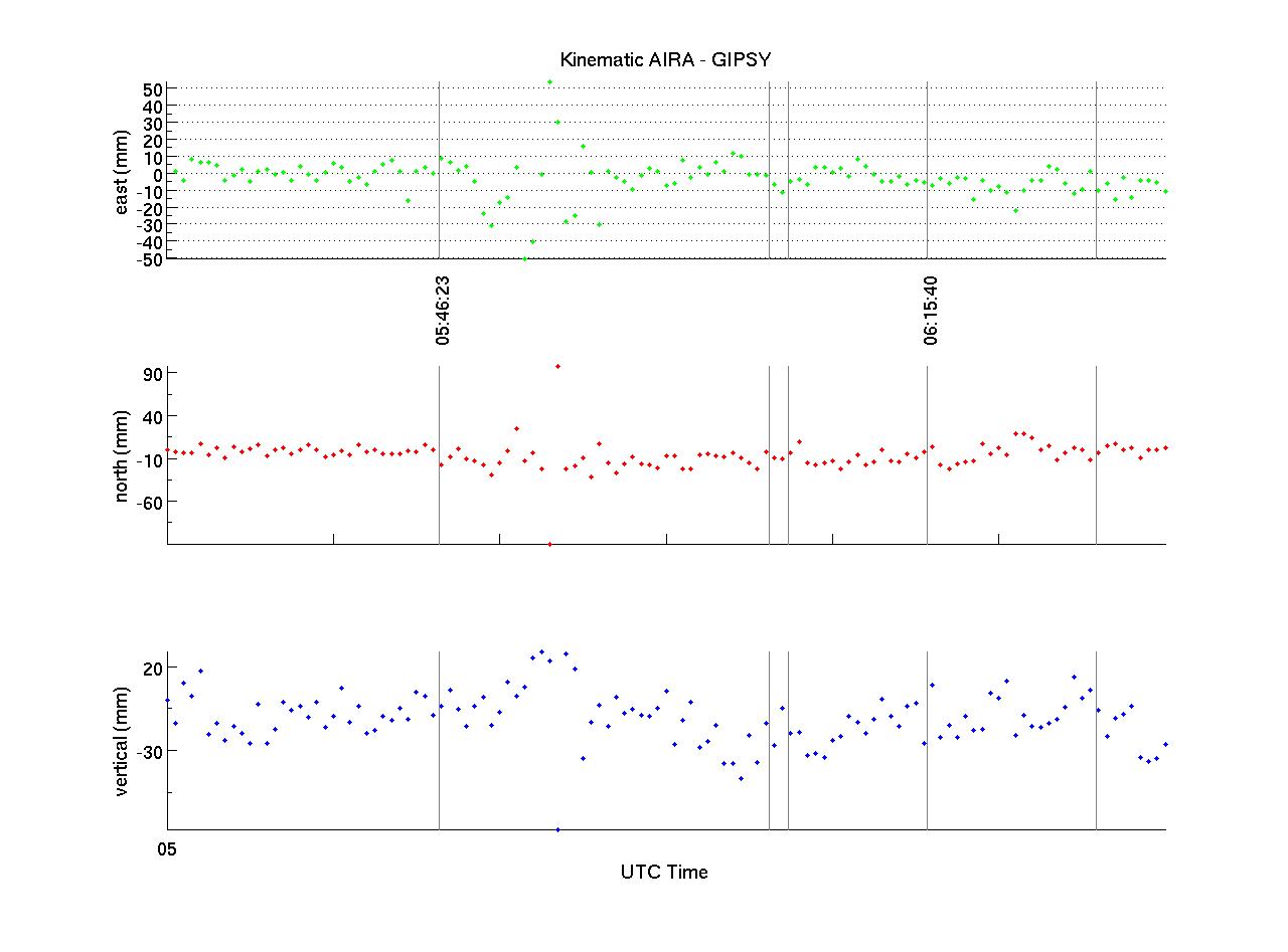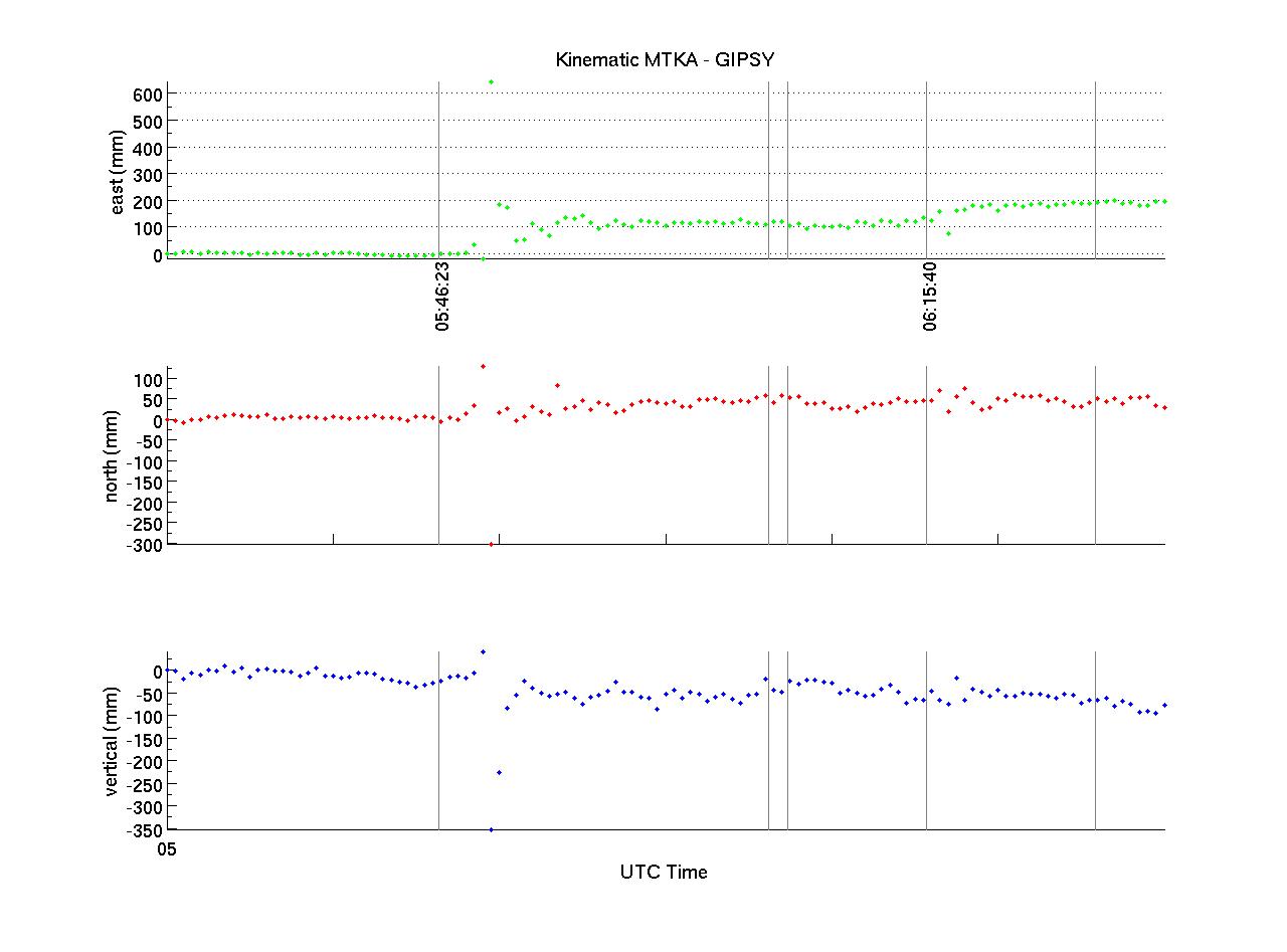 The long wavelength features in the vertical component of USU3 during the time of the earthquake does not seem to be related to the event since the full day solution shows multiple such excursions. Only processing of additional days will allow for an interpretation of this signal. However, I want to draw your attention to the vertical signal for stations TSKB/TSK2 which are nearly co-located (~40 m apart). The signals appear rather similar for these two sites mainly with a strong subsidence signal after the earthquake (about 18-20cm peak to peak). Due to the different geometry at these sites and the amplitude of the signal, this is unlikely to be a multi path effect and might be due to a long wavelength loading signal. Which due to the nature of load displacements is unlikely to be visible in the horizontal. We speculate this to be due to changes in ocean load (tsunami).