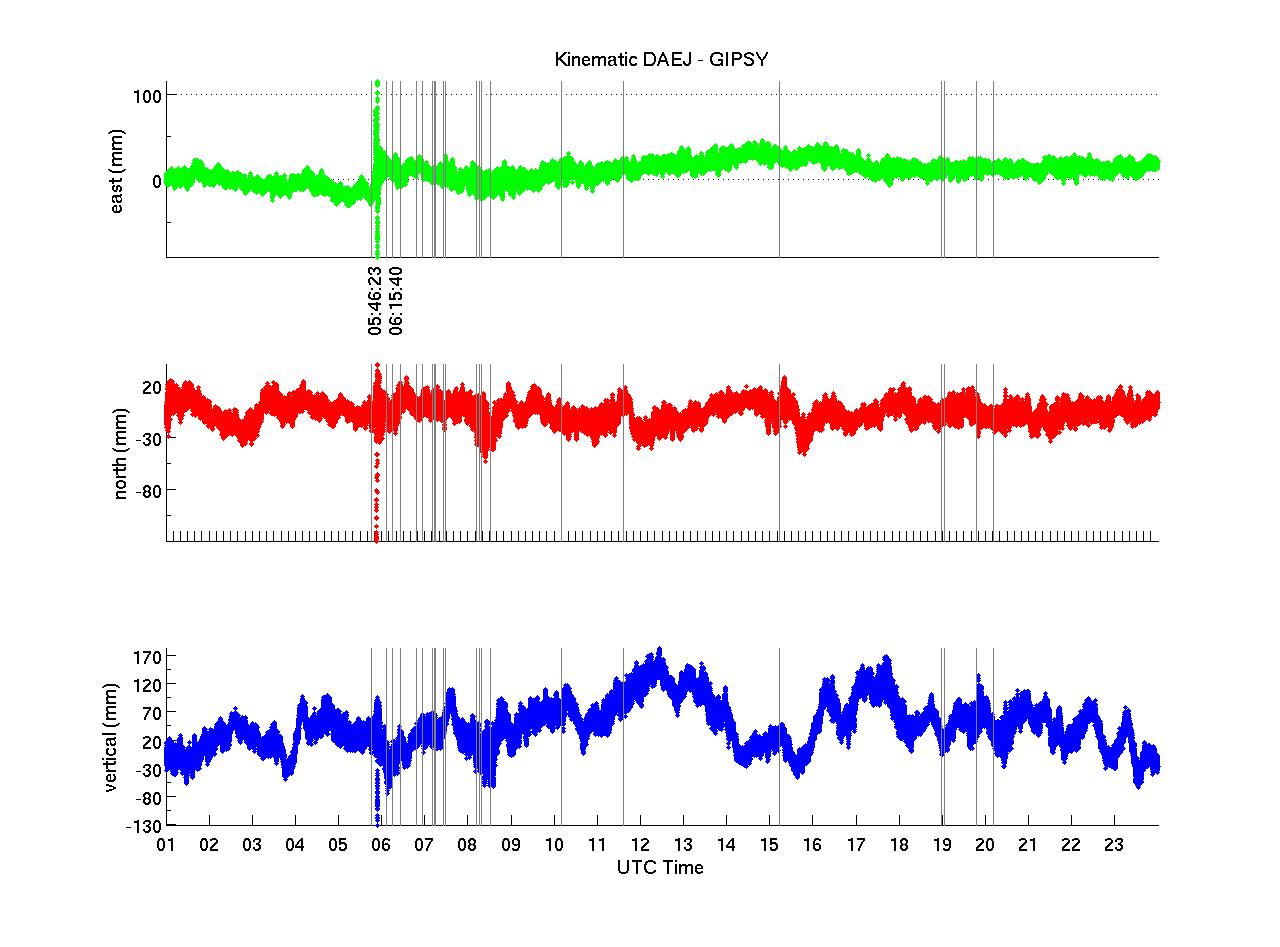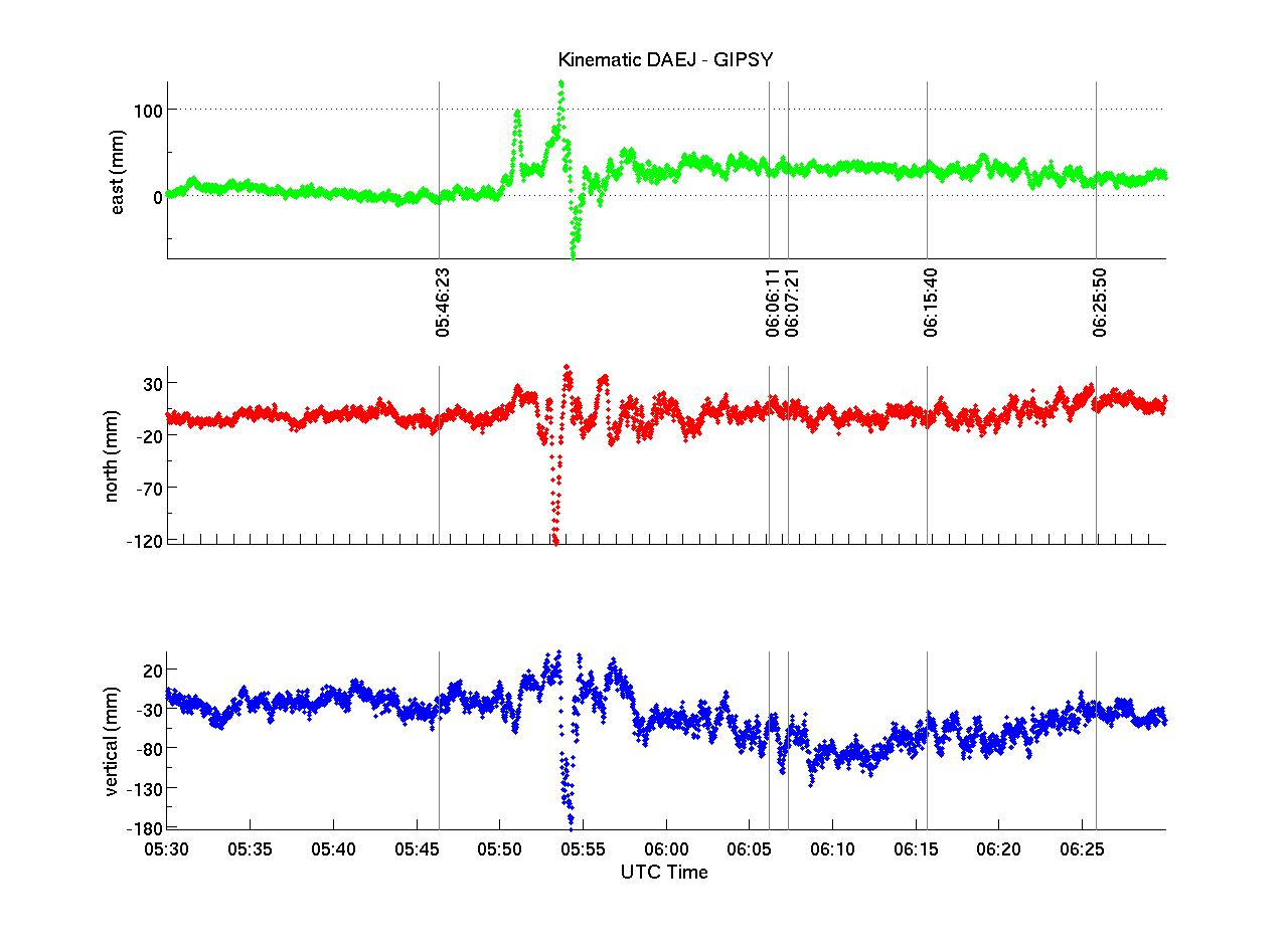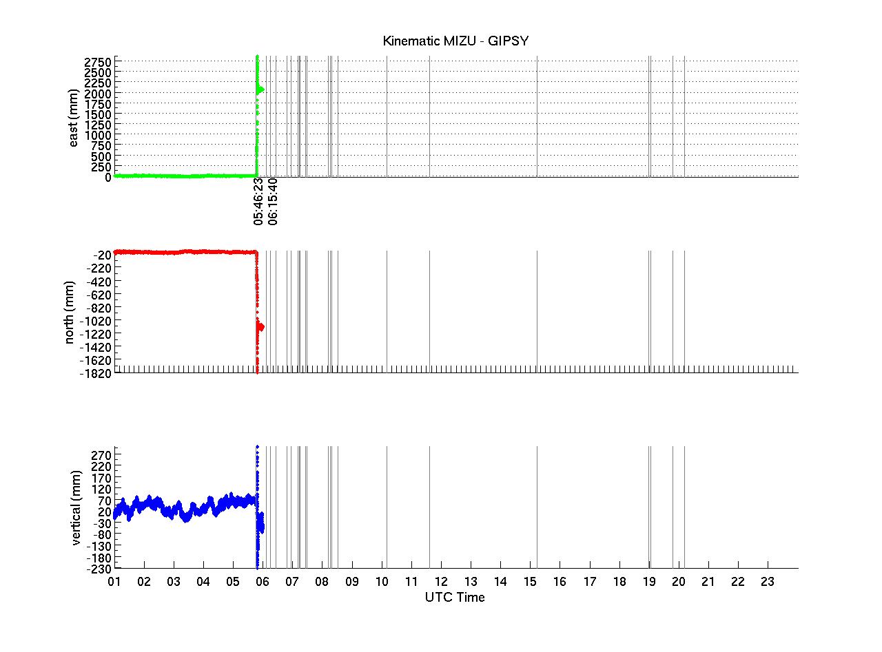 Figure shows wavefront propagation through a small subset of continuous GPS stations MIZU, TSKB, TSK2, MTKA, USU3, AIRA, DAEJ in east, north and vertical components (see map for positions). The respective displacements have been normalized between [0,1]. Position measurements have been connected in a continuous line for better visibility; note that 30 sec stations are indented and plotted in light blue. Vertical gray bars denote earthquakes M>=6.0 with origin time given for the two displacement inducing earthquakes. Seismic waves arrive at the closest site MIZU approx. 1 min after the first earthquake (distance approx. 135 km). The most distant site processed, DAEJ, shows signs of surface waves about 5:40 (S-wave?) and 7:20 min (Surface wave) after the earthquake (distance approx. 1340 km). This puts the travel time for the surface waves somewhere between 2-3 km/s. Displacements due to the second earthquakes are visible, but travel time for TSK2 and TSKB is hardly significant since it is 30 second data. The surface wave for this quake arrives at USU3 approx. 1 minute after the event (distance approx 250 km). Note that distances are subject to change pending final locations of the earthquakes.