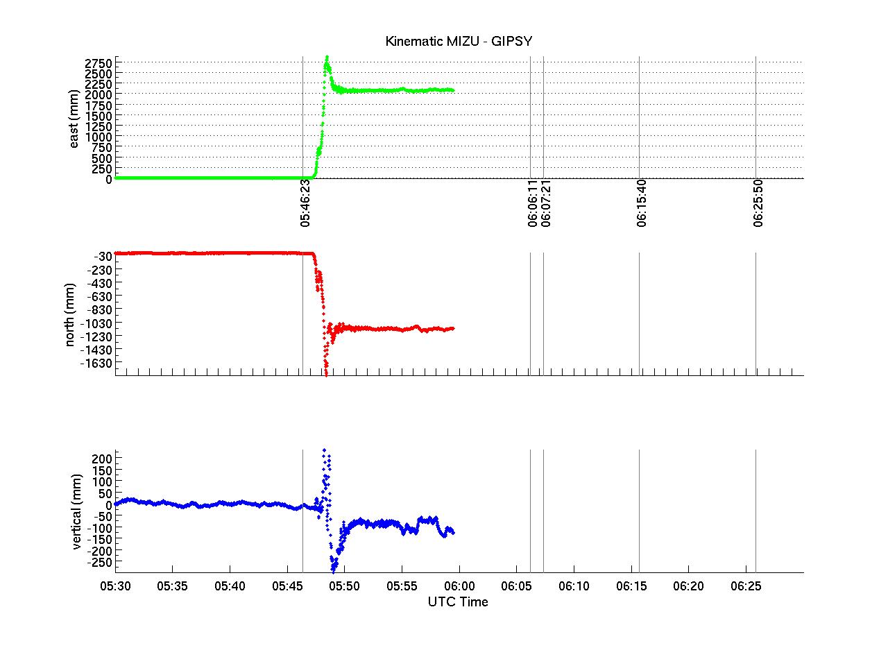 1Hz solutions is considered to be low compared to travel times. Offsets at MIZU for the main shock are estimated from the figure (will be refined later).