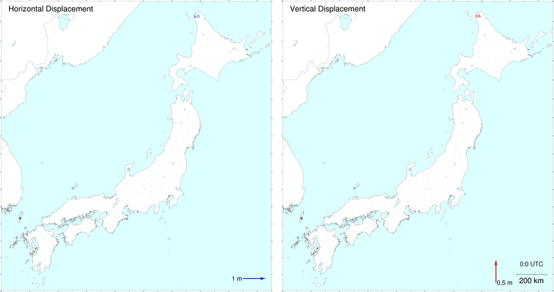 We provide you with the displacements to both earthquakes at sites DAEJ, MTKA, MIZU, TSK2, TSKB, USU3 (USUD) (see map):
